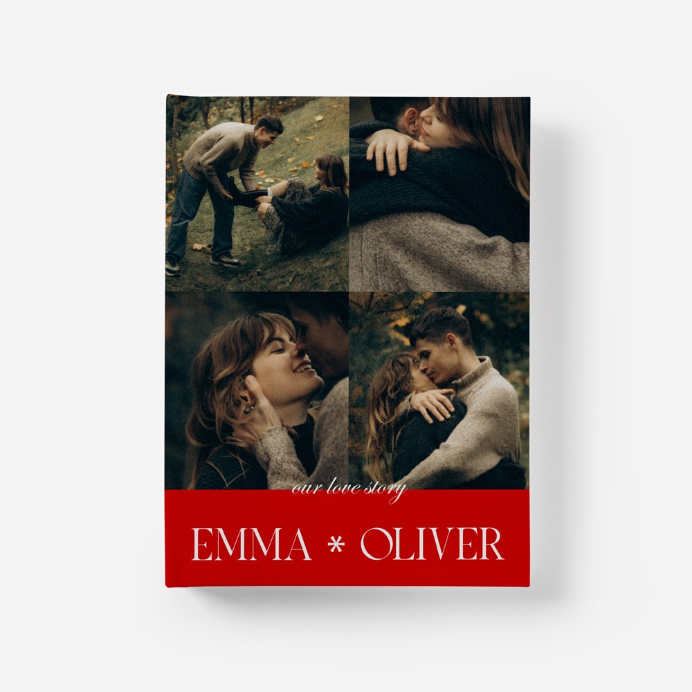 Transforme a história de vocês em uma verdadeira edição de colecionador com o tema Love Story. Com uma estética editorial e cinematográfica, este álbum valoriza a foto favorita do casal em grande destaque, complementada por uma faixa vermelha marcante e uma tipografia elegante. É a escolha ideal para casais que desejam eternizar seus capítulos com o glamour e o protagonismo de uma capa de revista.