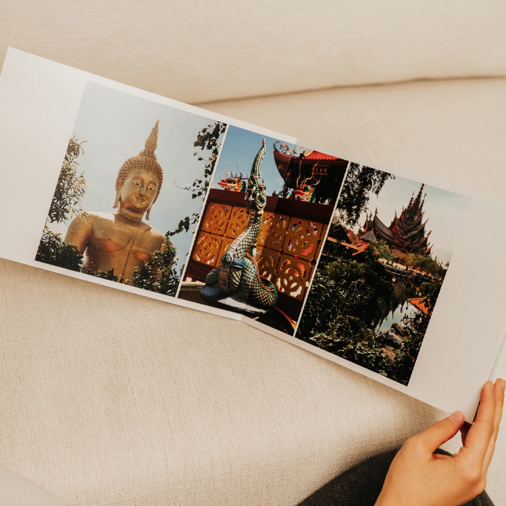 A abertura panorâmica permite que uma única foto ocupe ambas as páginas, oferecendo uma visualização perfeita das suas imagens, sem interrupções ou partes ocultas.